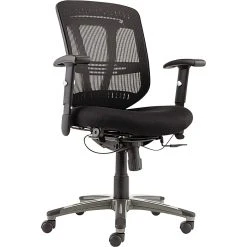 Warranted for continuous 24-hour use. Ergonomic design combines with high performance functions for all-day comfort. Multifunction mechanism allows back angle adjustment relative to seat, adjustable tilt (free floating or infinite locking positions) and forward tilt. Waterfall seat edge reduces pressure at the back of knees. Padded slant T-arms are height- and width-adjustable. Impact-resistant molded plastic shell. Five-star base with casters for easy mobility.