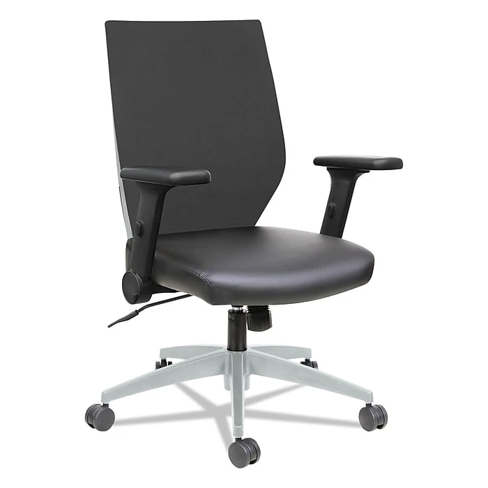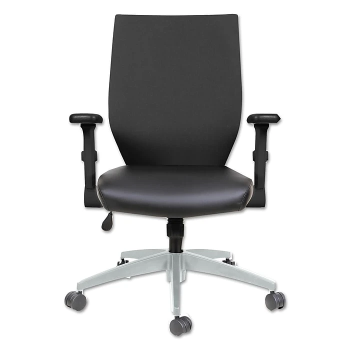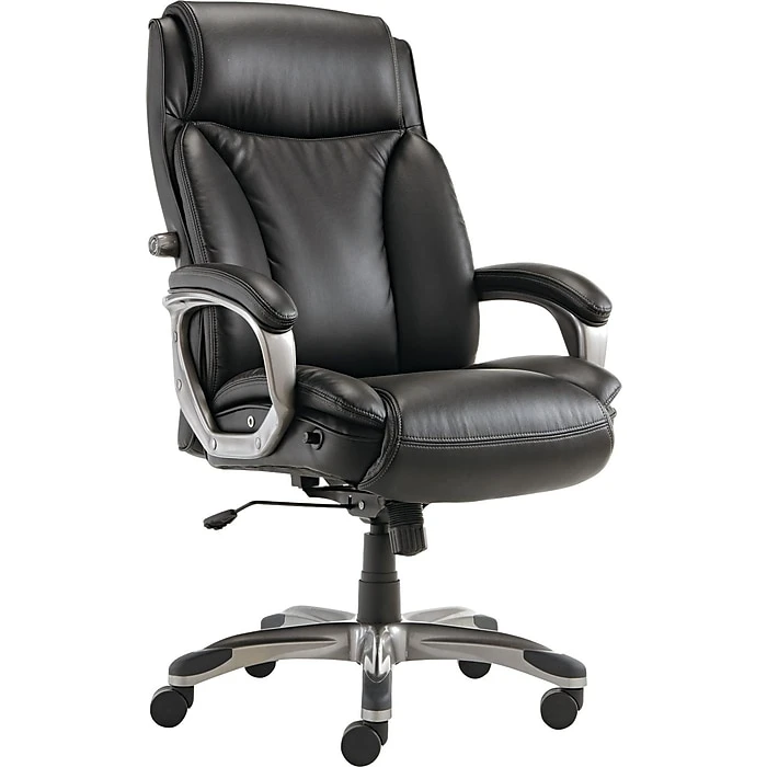 Increase productivity at your workplace with the black Alera Contemporary Executive Chair that is ergonomically designed to provide comfort while working. For extra softness and cushioning, this high-back executive chair has high-quality leather upholstery. This chair has a knee/synchro/center-tilt function that allows you to rest your feet on the floor in an upright or a reclined position. This chair is designed to offer lumbar support by conforming to the curve of your body. It lets you fix the lumbar support and seat at a required height with its adjustable back height and seat depth features.