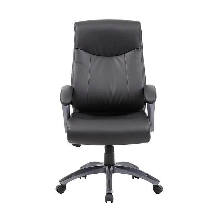When it comes to comfort, our double layer executive chair will make sure you never settle for second best. It is elegantly upholstered in black Leather Plus, a comfortable combination of leather and polyurethane that provides softness and durability. In addition to its padded armrests and gun metal finish, it features pneumatic gas lift seat height adjustment and adjustable tilt tension control. All of this rests atop a large 27” nylon base with five hooded double wheel casters.