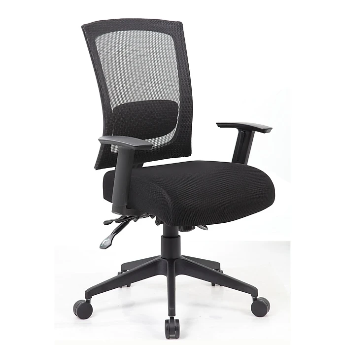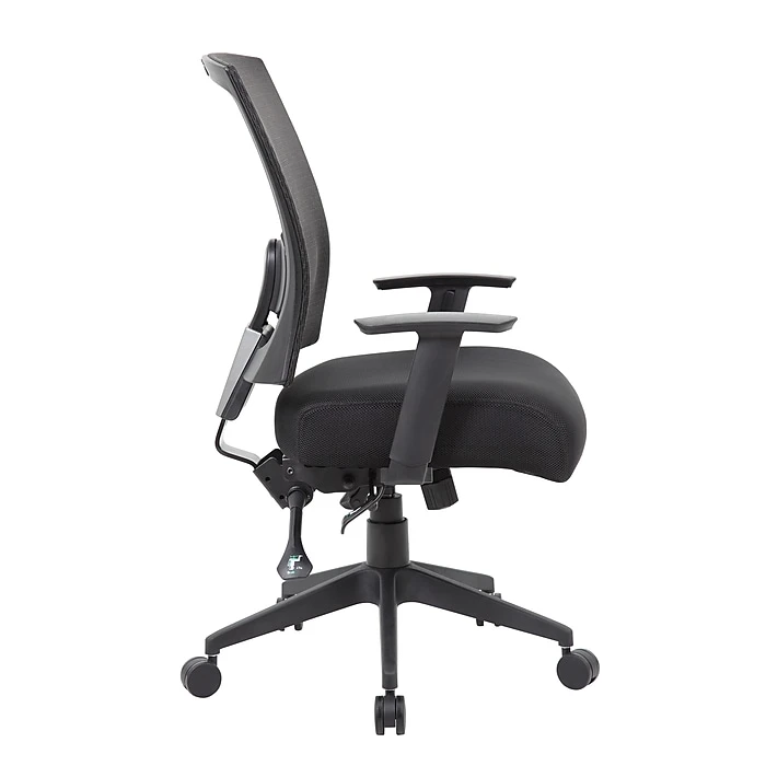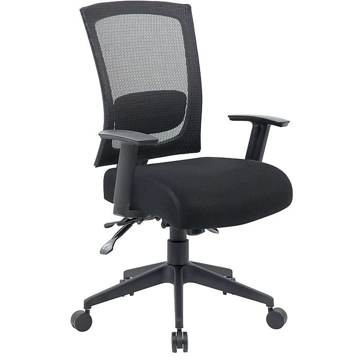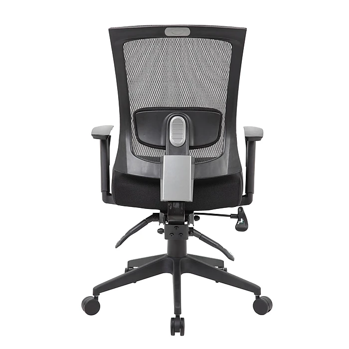 This multi-function task chair is perfect for any office environment. It features a mesh back with lumbar support, ratchet back height adjustment, and adjustable tilt tension control. Its 3 paddle multi-function tilting mechanism allows for easy adjustment and locks in any position for maximum comfort. Thereโs also a new SereneSoft seat with pneumatic gas lift seat height adjustment, horizontal mesh back, and mesh arm pads attached to adjustable height armrests. All of this is supported by a 25-inch black nylon high crown base with hooded double wheel casters.