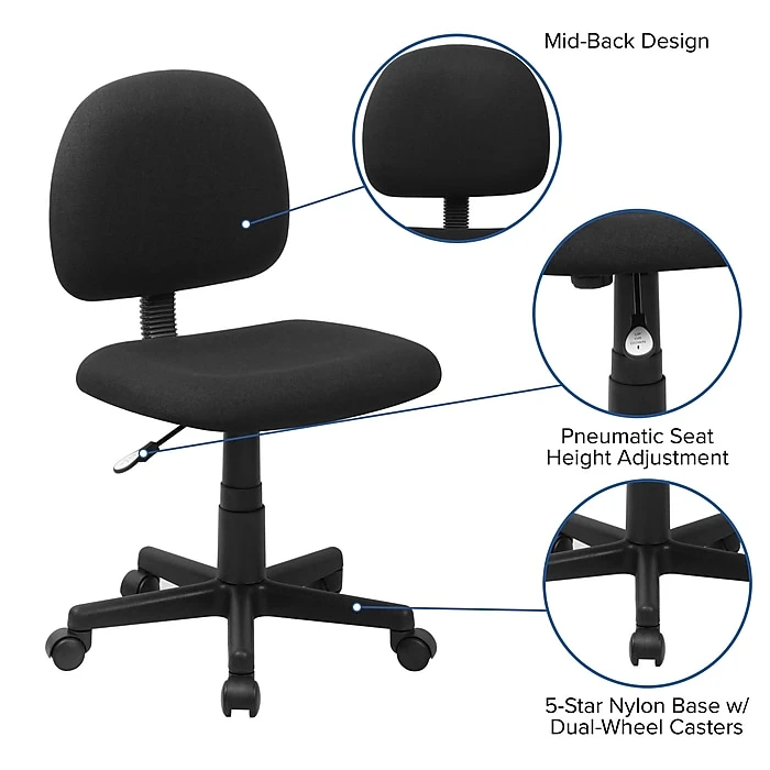 The Flash Furniture Contemporary Task Chair in an attractive black shade blends with any decor and will be the perfect addition to your office space. Furnished with high-quality fabric upholstery, this mid-back task chair adds a fresh look to your workspace. Its pneumatic seat height adjustment mechanism lets you alter the height to attain a comfortable posture. This task chair is made of fire-retardant foam that makes it an ideal choice in order to minimize the danger in case of extreme situations.