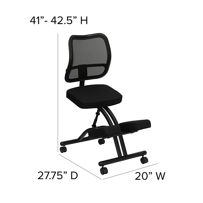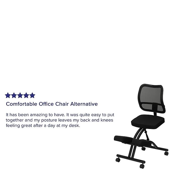 Innovative DesignThe Flash Furniture mobile ergonomic kneeling chair features a gently curved frame that strengthens key back muscles. The back of the Flash Furniture curved mesh-back chair promotes air circulation for coolness, a nd the ergonomic curved frame encourages proper posture in almost any position. An extra layer of cushioning directly beneath the upper thighs and lower spine and the thick pads under the knees offer all-day comfort. Sturdy and Agile FrameWith its four dual-wheel casters, the Flash Furniture kneeling chair is easy to move from one work area to another, making it well suited for multiple users in open office environments. The wide and incrementally adjustable powder-c oated scissor frame supports weights of up to 250 pounds, so it’s versatile enough for shared work spaces. To encourage mobility, the Flash Furniture black mesh chair is light and easy to maneuver.