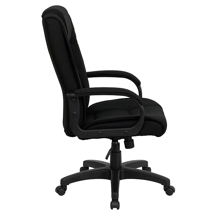 Tackle your most important work comfortably with this Flash Furniture high-back executive chair. The fixed arms feature a sloped design to support your shoulders, arms and hands, while the contoured seat and back come with plush padding for added cushion. Durable fabric upholstery lends a modern look to this chair while also withstanding everyday wear and tear. Featuring a swivel seat and dual-wheel casters, this chair lets you move freely about the office. Find the perfect height for your seat with the pneumatic height adjustment feature, and recline into a more relaxed position with the tilt tension control. With built-in lumbar support, this Flash Furniture high-back executive chair helps relieve stress and strain on tired back muscles.