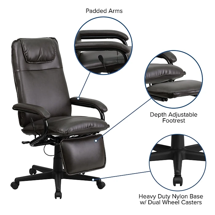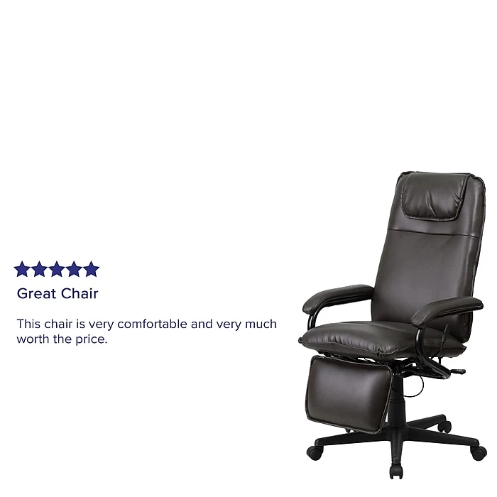 Easy CustomizationThis Flash Furniture black recliner chair allows the user to lay back at the press of a lever. In addition, it also allows the user to adjust the height of the chair up to four inches as well as recline the chair to his or her liking. The Flash Furniture high back executive office chair in brown also includes five twin-wheels that work well on both carpet and wood floors for added mobility.Eco-FriendlyThe materials and labor used to build this chair reach or exceed the ANSI/BIFMA furniture standards for sustainability. This ensures the chair was made with eco-friendly materials and energy usage during the manufacturing process was minimized.Promotes Good PostureThis office chair also includes excellent lower back and spine support, amongst other comfort features. The lower back and lumbar support that the Flash Furniture high back office chair features, targets the lower spine and keeps y our abdominals, back, and neck in a proper, healthy position all day long. In addition, the headrest also helps keep the user’s head in good position.