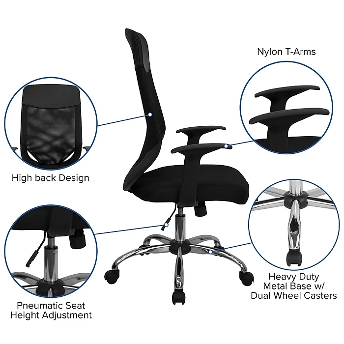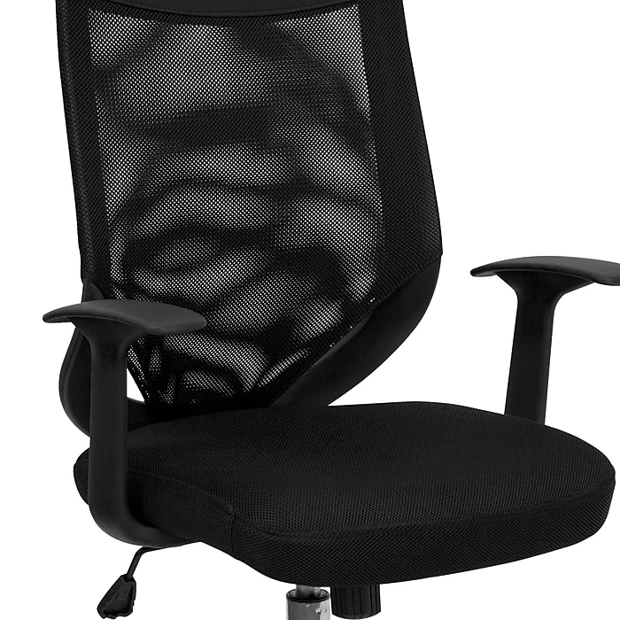 Long working hours are a breeze with the black Flash Furniture Contemporary Executive chair that guarantees comfort and support. For extra softness and cushioning, this executive chair has high-quality mesh upholstery. Its pneumatic seat height adjustment mechanism regulates the chair height and provides a balanced support to lower back. Equipped with a tilt function, this chair allows you to recline at a relaxed angle while reading or working.
