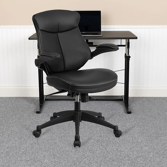 Take charge of your day with this versatile model chair that boasts style and comfort. This mid-back office chair offers support to the mid-to-upper back region, making it ideal for anyone who does a great deal of typing throughout the day. This chair f eatures a locking back angle adjustment lever that changes the angle of your torso to reduce disc pressure. The contoured seat dissipates pressure points for greater comfort, and the waterfall front edge removes pressure from the lower legs and improves circulation. Easily swivel this chair 360 degrees to get the maximum use of your workspace without strain. The pneumatic adjustment lever raises the seat to your desired height, and the flip-up arms provide the option of an armless chair without the ha ssle of detaching them. This chair’s ergonomic features and distinctive styling make it perfect for your home or office space.