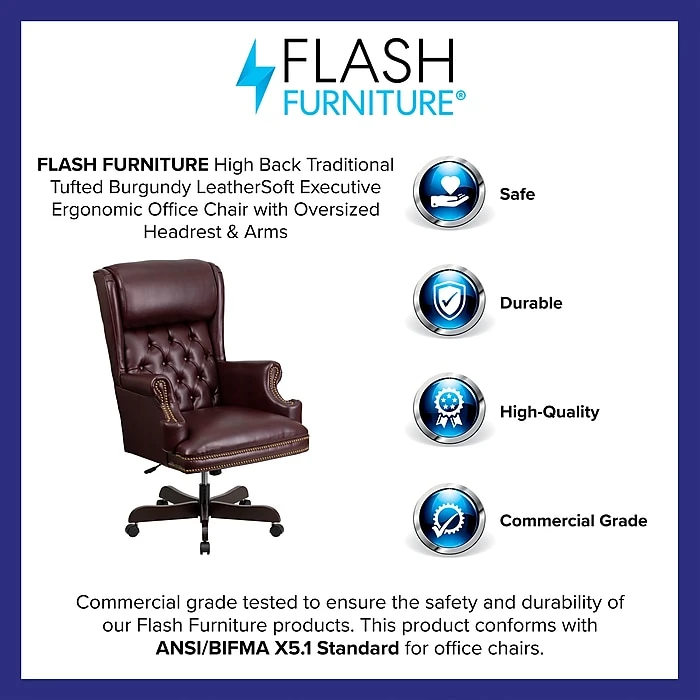 The Flash Furniture Traditional Executive Chair in an attractive burgundy shade blends with any decor and will be the perfect addition to your office space. Furnished with high-quality leather upholstery, this high-back executive chair adds a fresh look to your workspace. Its pneumatic seat height adjustment mechanism lets you regulate the seat height to achieve a good sitting position. This chair has a tilt function that allows you to recline while reading or working. Thanks to the swivel function, the chair can rotate in all directions.