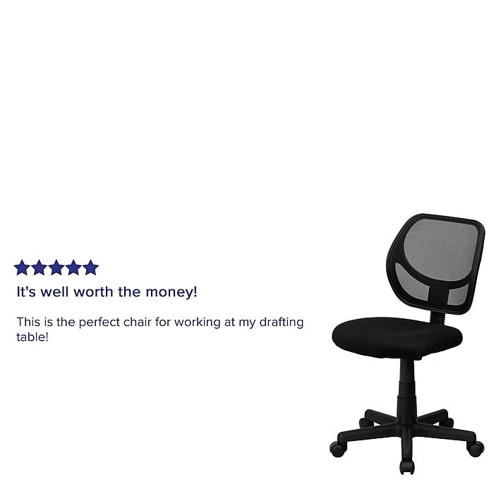 Enjoy comfort throughout the workday when you add this Flash Furniture armless mesh task chair to your workstation. The clean lines and simple design bring modern style to your office, while the breathable mesh back keeps you cooler as you rush to meet target deadlines. With a plush seat cushion and a mid-back design, this office chair provides added support for your frame. The swivel seat and rolling casters provide freedom of movement, making it easy to transition from your computer to file cabinets or a printer stand. Featuring a pneumatic seat height adjustment lever, this Flash Furniture armless mesh task chair lets you customize the seat position to match the height of your desk.