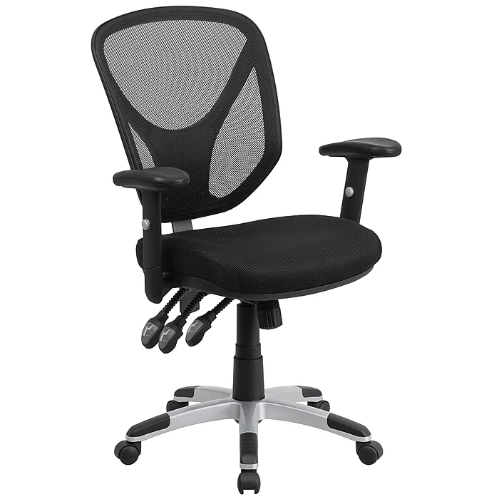 If you’re looking for an easy to adjust office chair than this triple paddle chair is an excellent choice. Mesh office chairs can keep you more productive throughout your work day with its comfort and ventilated design. The contoured seat dissipates pressure points for greater comfort. The mid-back design offers support to the mid-to-upper back region. The locking back angle adjustment lever changes the angle of your torso to reduce disc pressure. The locking tilt mechanism allows you to lock your cha ir in a comfortable work position. The waterfall front seat edge removes pressure from the lower legs and improves circulation. Chair easily swivels 360 degrees to get the maximum use of your workspace without strain. The pneumatic adjustment lever will allow you to easily adjust the seat to your desired height. The adjustable armrests take the pressure off the shoulders and the neck, which minimizes the risk of pain. This comfortably designed computer chair will make a great option for your home or o ffice space.