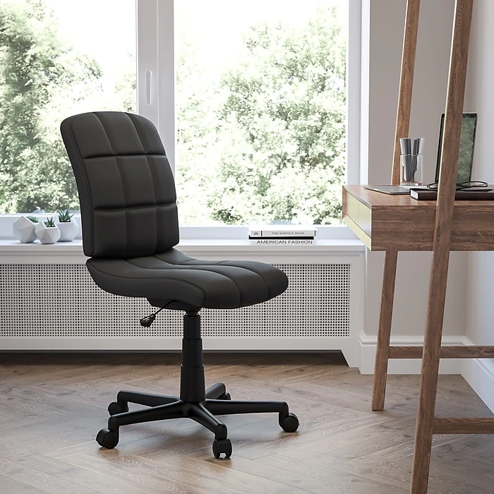 Complete your home office, computer terminal or reception desk with this Flash Furniture office chair. The armless design makes it easy to get in and out of the seat, while the simple silhouette offers a clean, modern look. With black vinyl upholstery, this desk chair is as durable as it is stylish. Plush padding provides added cushioning and support for long hours spent typing or researching, and the swivel seat lets you pivot from one side of your desk to the other. Featuring a thoughtfully positioned pneumatic seat-height adjustment lever, this Flash Furniture office chair lets you find the perfect setup to match your desk.