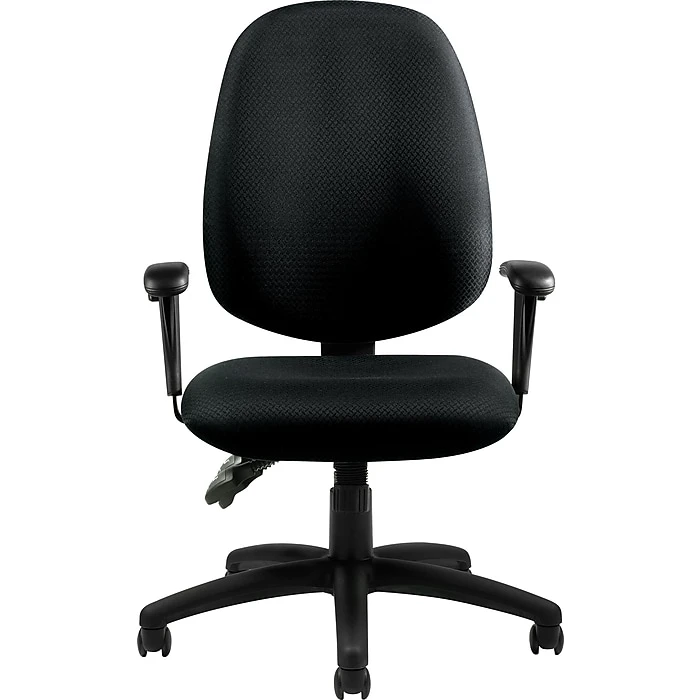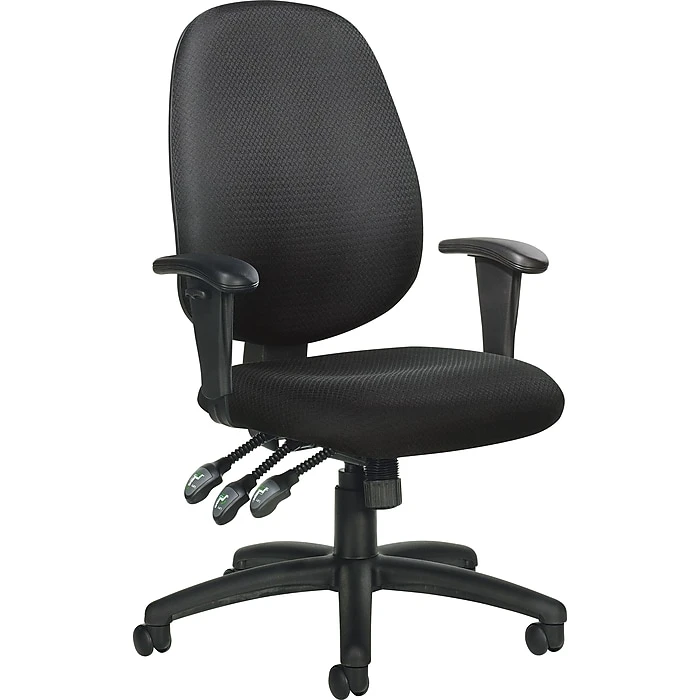 Get your work done in comfort in this customizable Global black task chair. Upholstered in an easy-to-maintain black fabric, this chair features adjustable arms that offer a customized fit. Use this Global multi-function fabric task chair in the office and sit in comfort with its lumbar height adjustment, which reduces stress on the back. The chair also comes with a scuff-resistant arched molded base and twin-wheel carpet casters that let the chair roll smoothly across most surfaces.
