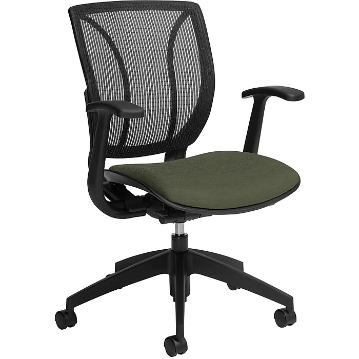 Global Roma Mesh back with arms computer chair with green grass urban fabric upholstery features pneumatic seat height adjustment and back tilt locking mechanism. Chair with arm caps has fiberglass reinforced nylon construction for durability.
