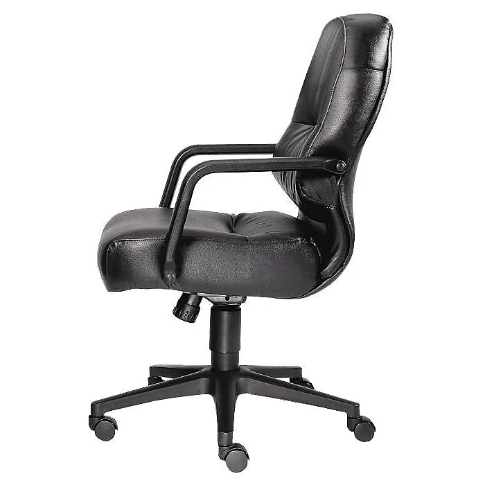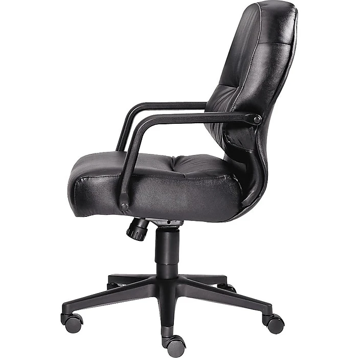 The HON pillow-soft executive chair in black is made of durable leather and is ideal for office desks. This chair measures 41.75 x 26.25 x 28.75 inches and has a back cushion that combines both foam and a layer of polyester fiberfill to support your spine.
