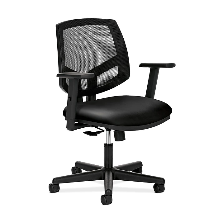 Volt seating from HON offers upscale style, full-scale comfort and impressive quality at a surprisingly affordable price. This mesh back chair with synchro-tilt has a generous seat cushion and a cooling mesh back for ventilation while performing active office work. Height-adjustable arms are included. Leather seat upholstery color is Black.