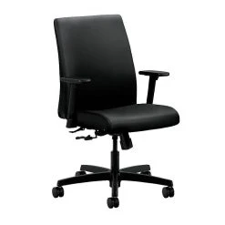 Ignition seating from HON fits your body, your work and your space. This low-back chair with center-tilt features adjustments not often found in its category, and is excellent for time-intensive activities. Its high recycled content reduces wood waste. Warranted for users up to 300 lbs. Height- and width-adjustable arms are standard for added comfort. Seat and back upholstery color is Black, and frame and base color is Black.