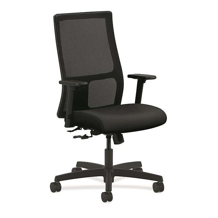 Ignition seating from HON fits your body, your work and your space. This mesh mid-back chair with center-tilt features adjustments not often found in its category, and is excellent for time-intensive activities. Its high recycled content reduces wood waste. Warranted for users up to 300 lbs. Height- and width-adjustable arms are standard for added comfort. Seat upholstery color is Black, and mesh, frame and base color is Black.