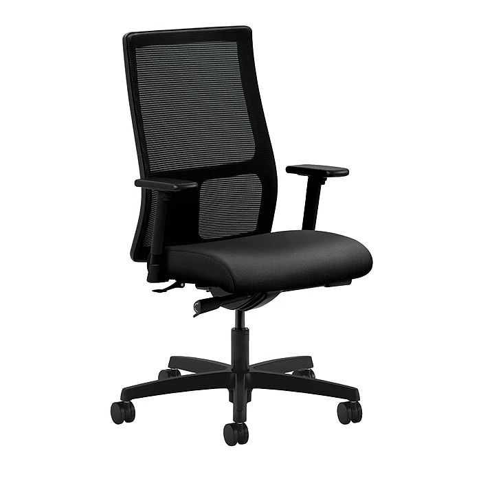 Ignition seating from HON fits your body, your work and your space. This mesh mid-back chair with synchro-tilt is a great blend of style and adjustability, and is excellent for time-intensive activities. Its high recycled content reduces wood waste. Warranted for users up to 300 lbs. Height- and width-adjustable arms are standard for added comfort. Seat upholstery color is Onyx, and mesh, frame and base color is Black.