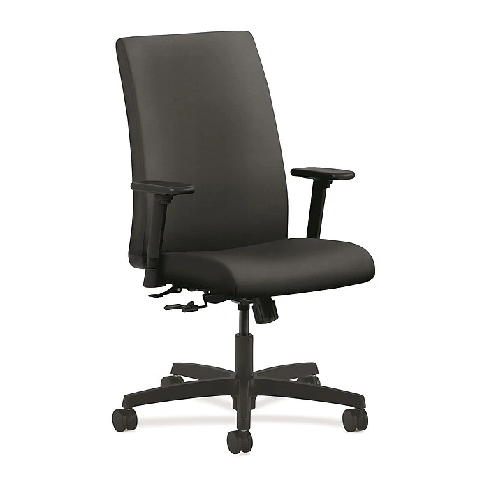Ignition seating from HON fits your body, your work and your space. This mid-back chair with center-tilt features adjustments not often found in its category, and is excellent for time-intensive activities. Its high recycled content reduces wood waste. Warranted for users up to 300 lbs. Height- and width-adjustable arms are standard for added comfort. Seat and back upholstery color is Onyx, and frame and base color is Black.