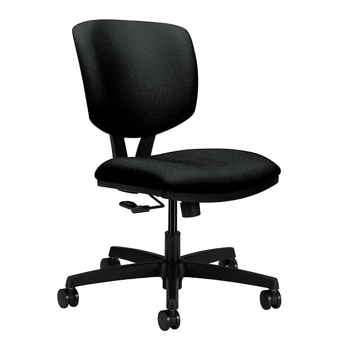Volt seating from HON offers upscale style, full-scale comfort and impressive quality at a surprisingly affordable price. This low-back chair with center-tilt has generous seat and back cushions that are contoured for comfort while performing active office work. Height-adjustable arms can be ordered separately. Seat and back upholstery color is Black.