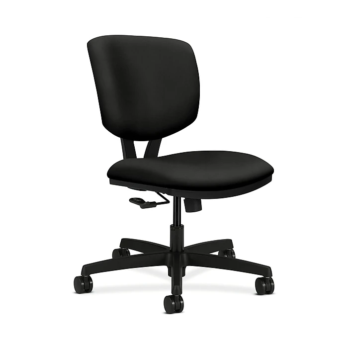 Volt seating from HON offers upscale style, full-scale comfort and impressive quality at a surprisingly affordable price. This low-back computer chair with center-tilt has generous seat and back cushions that are contoured for comfort while performing a ctive office work. Height-adjustable arms can be ordered separately. The seat and back upholstery color is black.