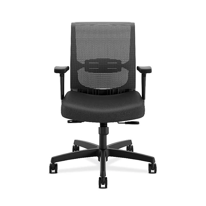 HON Convergence black vinyl task chairs with adjustable arms can be customized to each employee’s individual needs. The pivoting lumbar support conforms to your lower back to keep your spine aligned for better posture throughout the work day. Adjustable width and height arms help your hands and wrists stay nimble and comfortable when typing on your computer or making notes on your work surface. The synchro-tilt mechanism maintains proper balance when you lean forward and back, or while turning for a dynamically efficient chair.