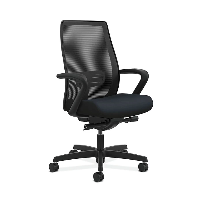 Endorse is The HON Company’s most adaptable seating collection. This mesh, mid-back task chair features adaptable comfort geometry, plus the added benefit of an easy-to-use built-in lumbar adjustment for exceptional lower back support. Synchro-tilt prom otes circulation and spinal alignment, and the standard pneumatic height and seat glide controls accommodate people of varying heights. Fixed arms help support the forearms and shoulders. The ilira -stretch back material provides natural ventilation. Wa rranted for users up to 300 lbs. Frame and back mesh color is Black and seat upholstery color is Navy.