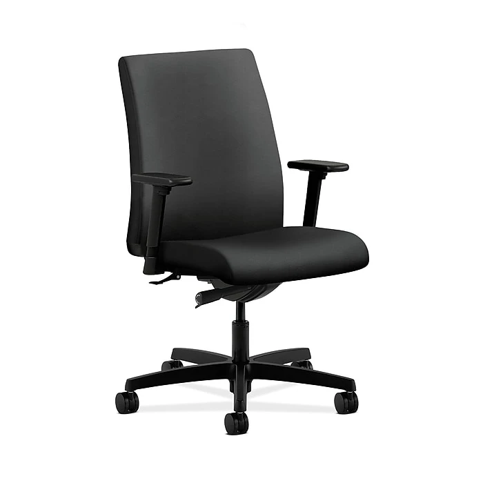 Ignition seating from HON fits your body, your work and your space. This low-back chair with synchro-tilt is a great blend of style and adjustability, and is excellent for time-intensive activities. Its high recycled content reduces wood waste. Warrante d for users up to 300 lbs. Height- and width-adjustable arms are standard for added comfort. Seat and back upholstery color is Onyx, and frame and base color is Black.