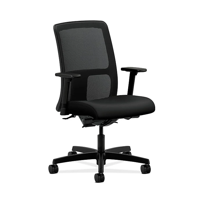 This Ignition chair from HON fits your body type, work and space. This low-back chair with synchro-tilt and independent back angle offers an exceptional range of motion. It is excellent for time-intensive activities. Its high recycled content reduces wo od waste. With a weight capacity of to 300 lbs., it features height- and width-adjustable arms for added comfort.
