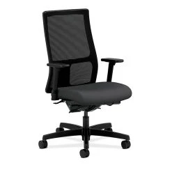 Ignition seating from HON fits your body, your work and your space. This mesh mid-back chair with synchro-tilt and independent back angle offers an exceptional range of motion and is excellent for time-intensive activities. Its high recycled content red uces wood waste. Warranted for users up to 300 lbs. Height- and width-adjustable arms are standard for added comfort. Seat upholstery color is Carbon, and mesh, frame and base color is Black.