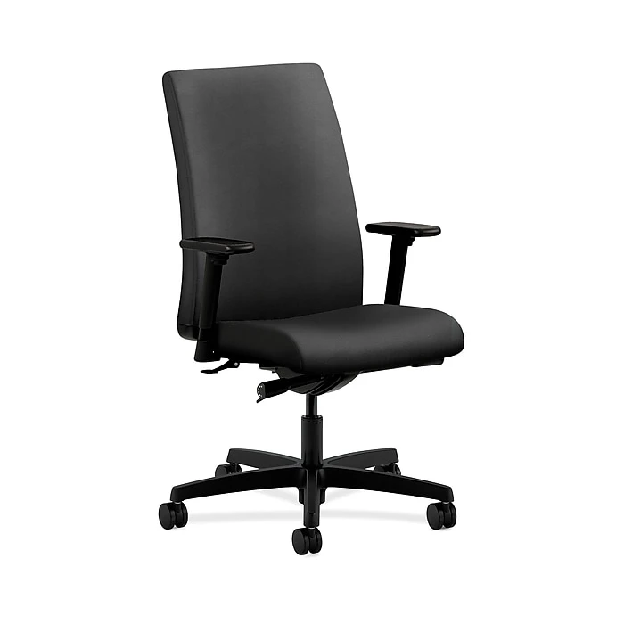 Ignition seating from HON fits your body, your work and your space. This mid-back chair with synchro-tilt is a great blend of style and adjustability, and is excellent for time-intensive activities. Its high recycled content reduces wood waste. Warrante d for users up to 300 lbs. Height- and width-adjustable arms are standard for added comfort. Seat and back upholstery color is Onyx, and frame and base color is Black.