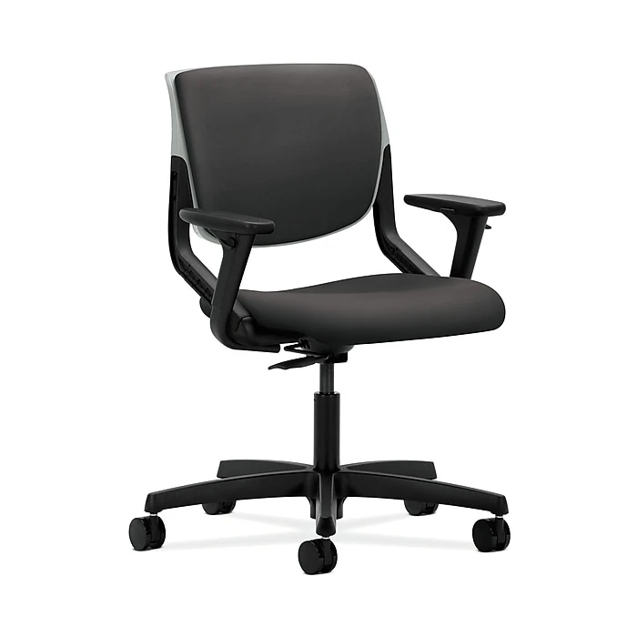 HON Motivate seating transforms any space into a dynamic environment. This task chair incorporates both great style and good ergonomics. The flex-back motion helps support the spine. Shell color is Platinum, back and seat upholstery color is Carbon, and base is Black.