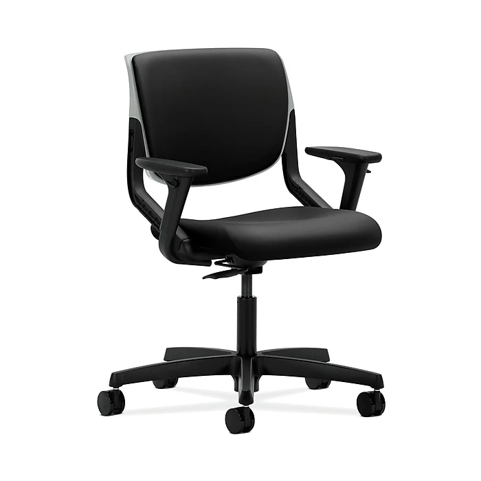 HON Motivate seating transforms any space into a dynamic environment. This task chair incorporates both great style and good ergonomics. The flex-back motion helps support the spine. Shell color is Platinum, back and seat upholstery color is Black, and base is Black.