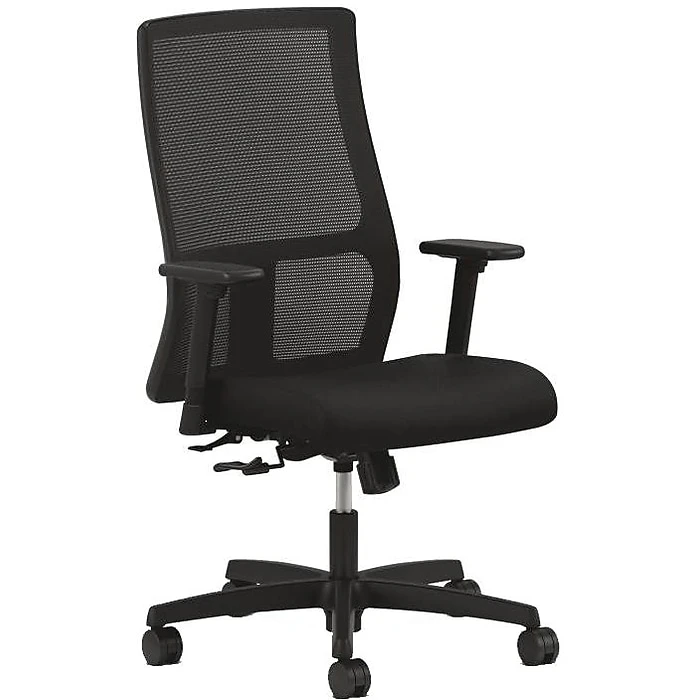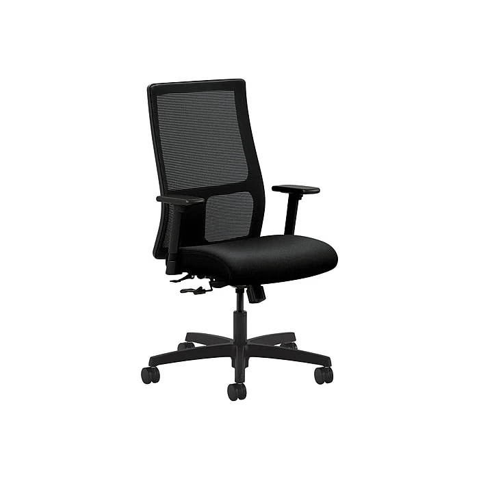 Lean back in comfort with this HON Ignition mid-back task chair. A breathable mesh back keeps you cooler for long stretches spent at your desk, while the plush seat padding offers added cushion and support. The back and seat height adjustment features let you customize the fit of this chair to suit your needs and match your desk setup. Use the height- and width-adjustable arms to find the perfect configuration to fit your frame so you can stretch out as you work on big projects. With 360-degree swivel action and rolling casters, this HON Ignition mid-back task chair makes it easy to transition between tasks or move about the office.