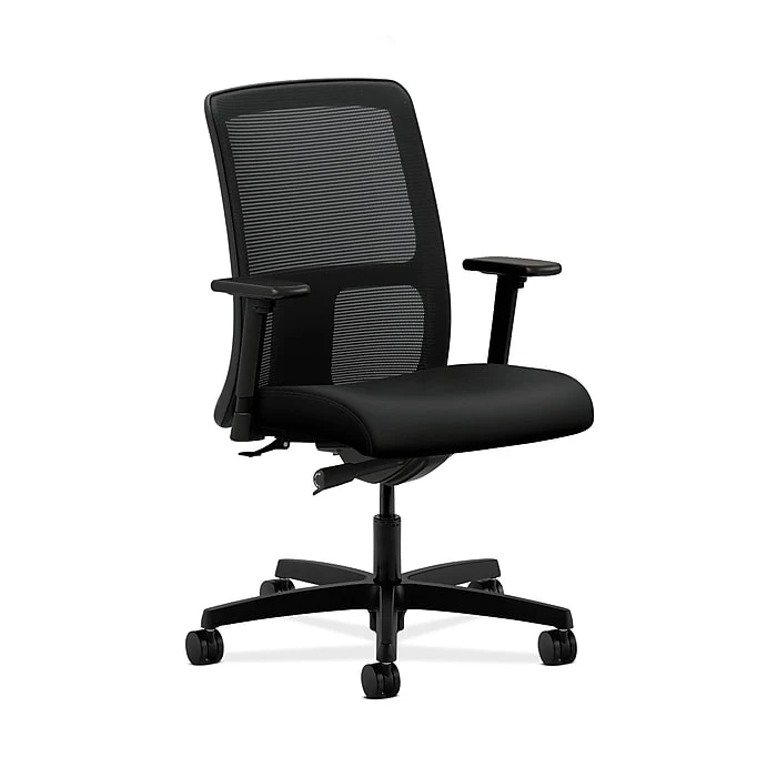 Ignition seating from HON fits your body, your work and your space. This mesh low-back chair with synchro-tilt is a great blend of style and adjustability that is excellent for time-intensive activities. Its high recycled content reduces wood waste, and the chair is warranted for users up to 300 pounds. Height- and width-adjustable arms are standard for added comfort. The seat frame, mesh and upholstery are all black.