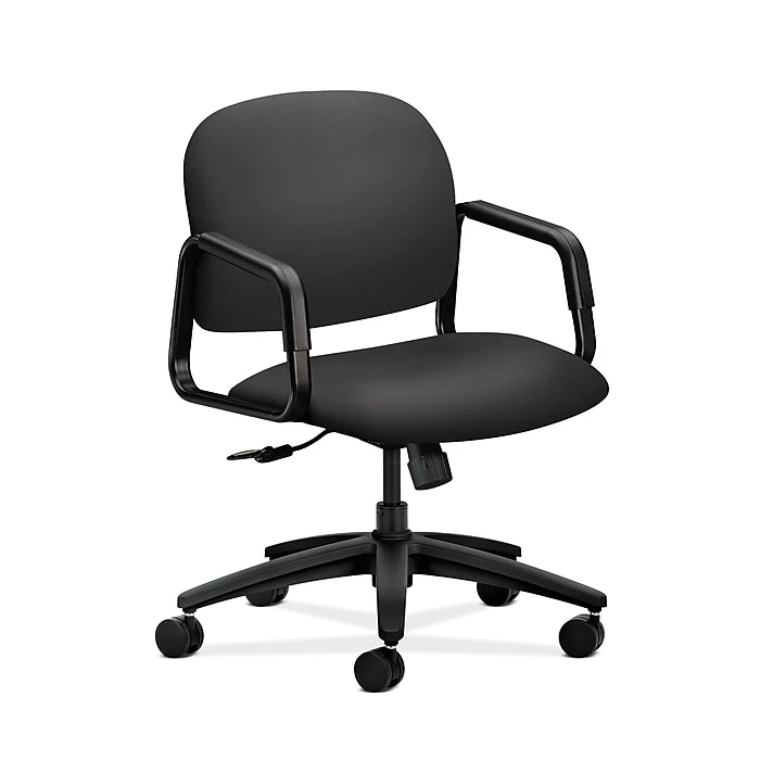 Everywhere you go, people rely on HON 4000 Series Solutions seating for dependability and comfort. This mid-back chair features a floating backrest gives your spine maximum support. The proven center-tilt mechanism allows you to comfortably recline. Fix ed arms are integrated into the frame. Seat and back upholstery color is Carbon, and frame color is Black.
