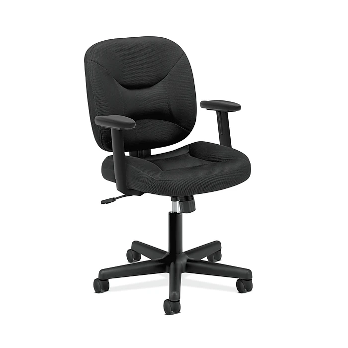 This HON ValuTask low-back chair has center-tilt control with lock and tension control. Upholstered seat and back, double-layered seat cushions and waterfall seat edge give this chair a broad appeal at a compelling price. Height-adjustable arms allow you to customize the comfort to fit your body. Seat and back sandwich mesh upholstery color is Black.