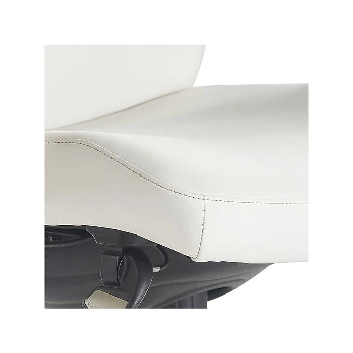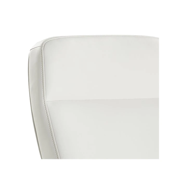 - White faux leather offers smooth seating, while brushed nickel metal accents add subtle luster