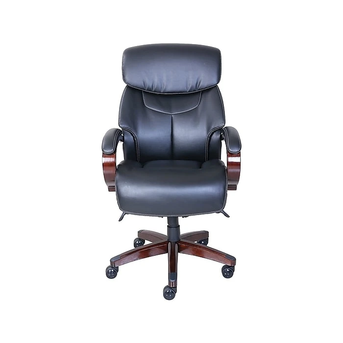 Create a bold, modern look for your office with this La-Z-Boy Bradley executive office chair. The rich bonded leather upholstery and contrast stitching deliver upscale style, while the plush ComfortCore cushioning ensures all-over support. A waterfall seat design promotes better circulation so you can sit comfortably for longer. This chair boasts pneumatic seat height adjustment, tilt tension and tilt lock, providing convenient customization options. Fixed padded loop arms offer a place to way to rest your shoulders, hands and wrists after marathon typing sessions. Featuring a wood-finish five-star base and rolling casters, this La-Z-Boy Bradley executive office chair moves effortlessly from one side of your office to the other.