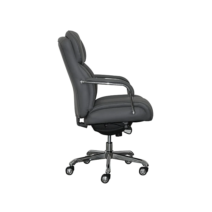 Complete the stylish look of your desk or home office space with the La-Z-Boy Sutherland bonded leather office chair. The Sutherland is upholstered in gray bonded leather and features stylish quilted stitching accents along the back and seat. Beautiful quilted stitching accents and generously padded headrest, arms, seat, and back add a sense of luxury to the modern, feminine design of this desk chair. The La-Z-Boy Sutherland office chair is perfect for positioning at your office desk, and the contoured lumbar will stay comfortable and supportive during long hours at work. The five casters allow the chair to glide easily, and the pneumatic seat height adjustment allows you to find your optimal comfort level. Live life comfortably with the La-Z-Boy Sutherland leather office chair.