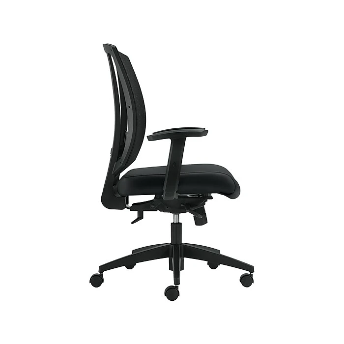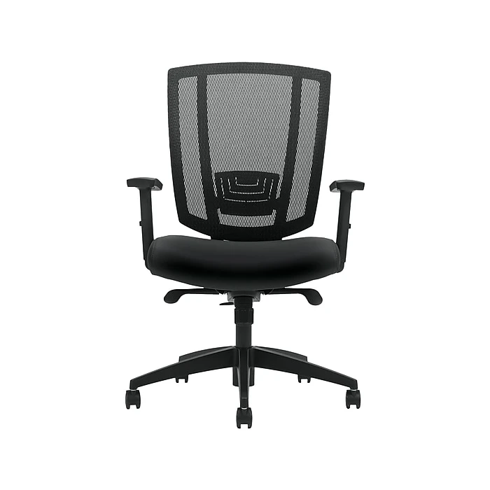 Offices to go mesh back synchro-tilter features a mesh back with Luxhide upholstered seat. Height and depth adjustment provides lumbar support. Also featuring height-adjustable arms.