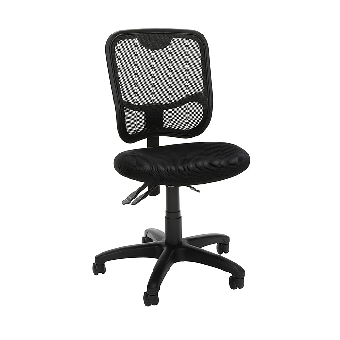 Outfit your reception area with this OFM Comfort Series mesh task chair. The mesh back allows air to flow freely, keeping you cool as you field client calls, while the generously padded seat makes it easy to relax. Featuring an armless design, this task chair frees up your range of movement so it’s simple to turn, retrieve a file and get back to work. Built-in lumbar support eases the strain on your back, while pneumatic high control raises and lowers the seat in relation to counter or desk heights. With its durable nylon base and dual-caster wheels, this OFM Comfort Series mesh task chair easily carries you from place to place.