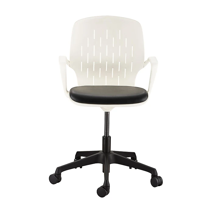 - White back and black upholstered padding on the seat and arms for comfort