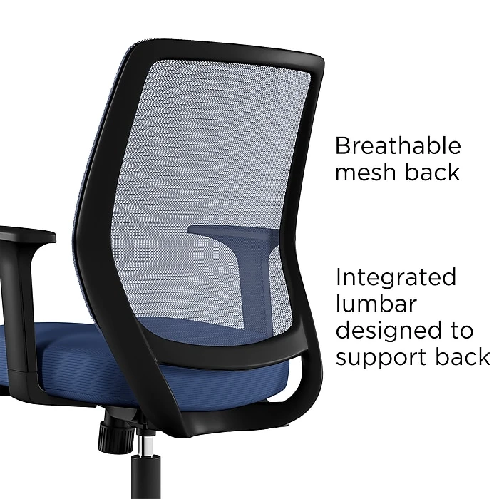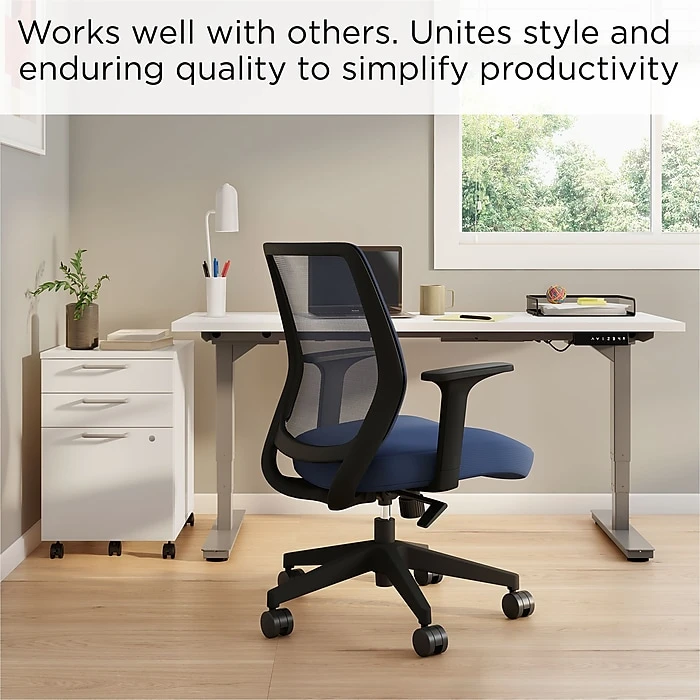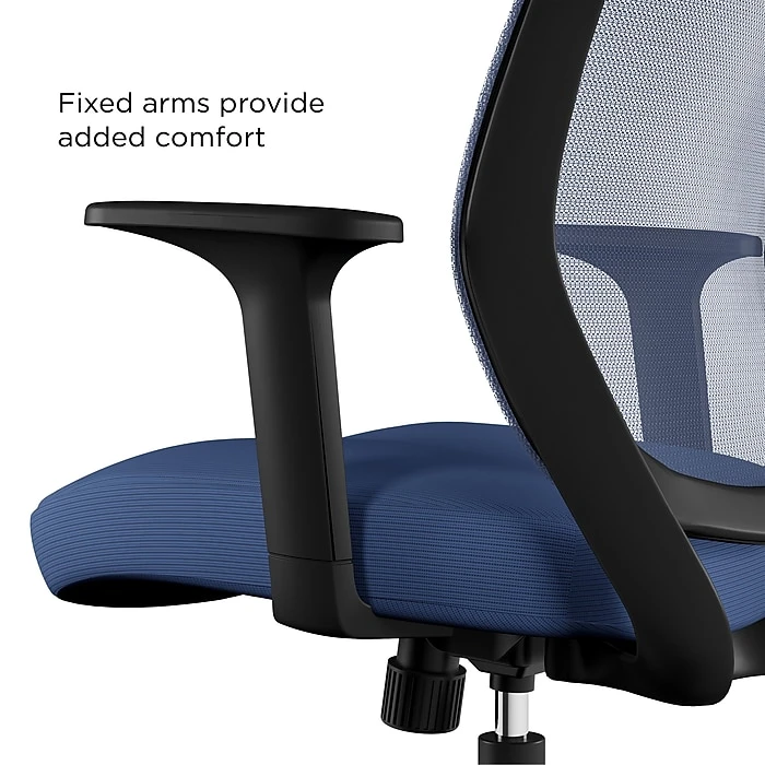Give your desk a modern upgrade with this task chair. The mesh back lets air circulate to keep you cooler throughout the day, while the plush contoured seat cushion delivers added comfort and lumbar support. A five-star base and rolling casters make it easy to glide from your desk to a nearby file cabinet or credenza. This chair features fixed arms for an extra layer of support. Tilt tension and tilt lock let you recline between conference calls and meetings. Featuring a seat height adjustment lever, this Union & Scaleâ„¢ Essentials mesh and fabric task chair can be customized to match the height of your existing workstation.